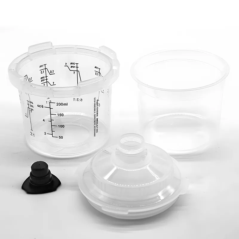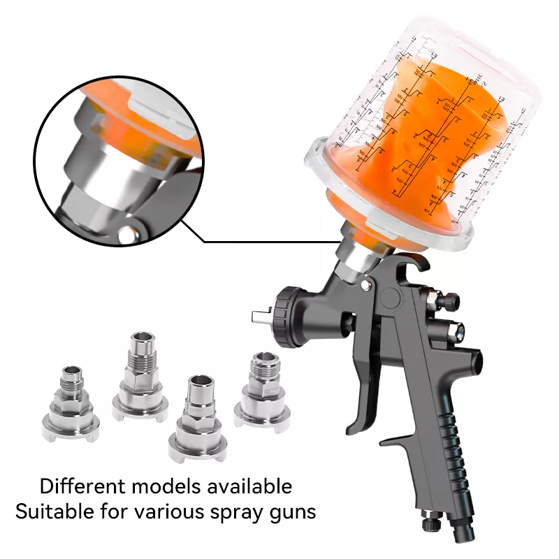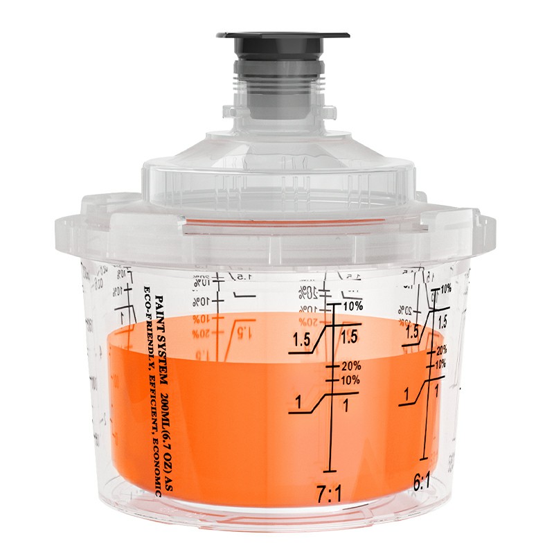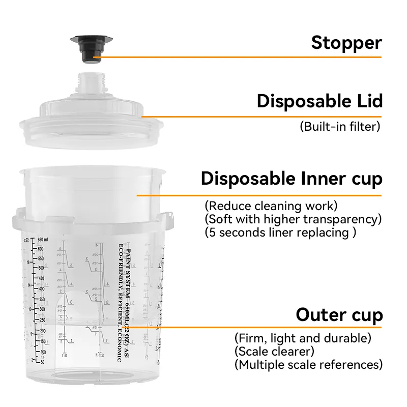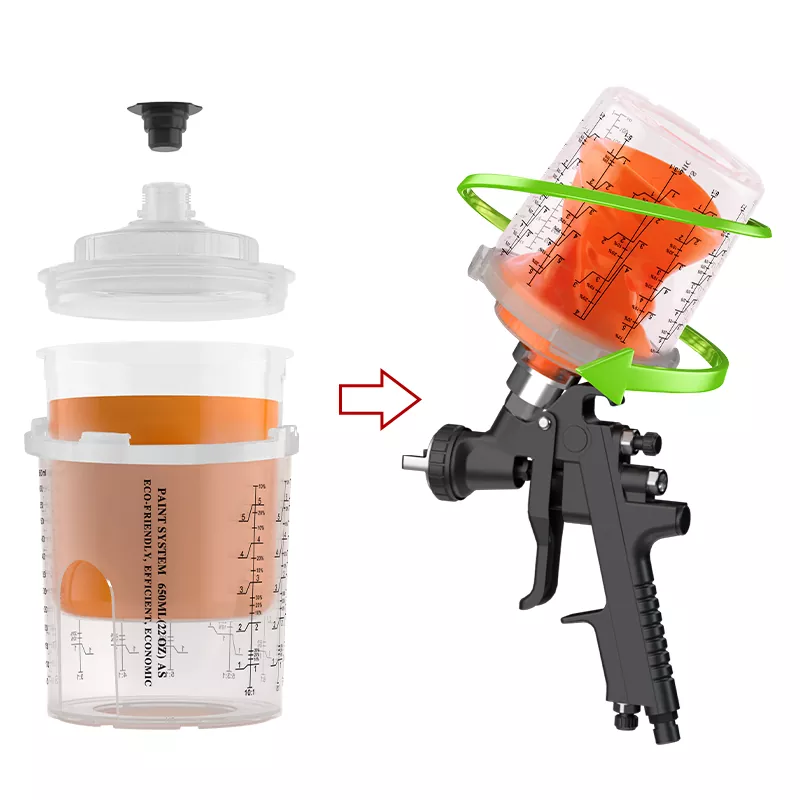 การออกแบบถ้วยโปร่งใสทำให้ง่ายต่อการสังเกตสีที่เหลือ ถ้วยสเปรย์แบบใช้แล้วทิ้งทำให้มั่นใจได้ว่าปืนสเปรย์สามารถพ่น 360 องศาโดยไม่ต้องรั่วไหลซึ่งสามารถปนเปื้อนพื้นผิวของเม็ดไม้ที่เกิดจากการหยดสี เหมาะสำหรับการพ่นสี PU/NC บนประตูไม้ตู้และเฟอร์นิเจอร์ไม้เนื้อแข็ง
