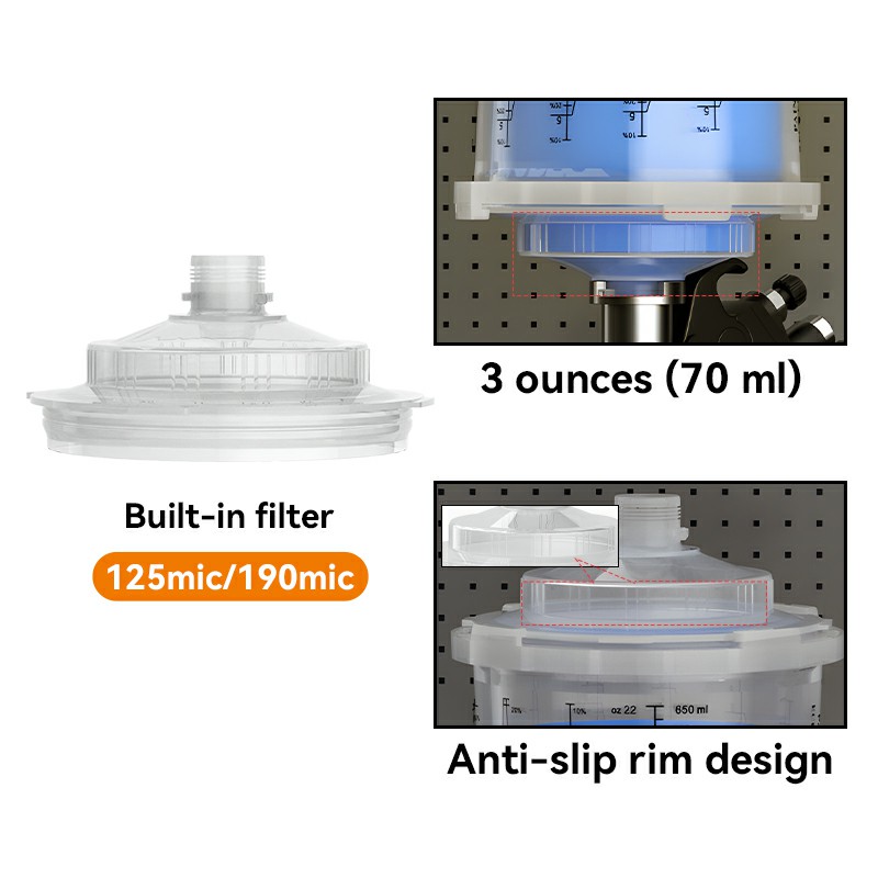 -ฝาคัพสเปรย์ AYS3.1 มีการก่อสร้างสองชั้นที่มีสีสูงถึง 3 ออนซ์ด้านล่างตัวกรอง ฝาช่วยเพิ่มการไหลของสีและความสอดคล้องในขณะที่ลดสาดน้ำจากต้นจนจบ