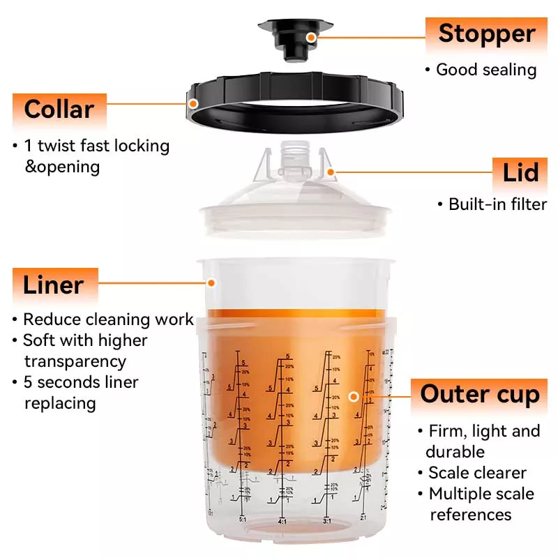 ระบบถ้วยสีแบบใช้แล้วทิ้งผสมผสานฟังก์ชันการผสม การกรอง การพ่น และการจัดเก็บไว้ในเครื่องเดียว สิ่งนี้ไม่เพียงทำให้การเตรียมสีเบื้องต้นง่ายขึ้น แต่ยังช่วยประหยัดค่าใช้จ่ายในการผสมถ้วยและกรวยกระดาษ ทำให้เป็นตัวเลือกที่สมบูรณ์แบบสำหรับการประหยัดเวลาในการเตรียมและปรับปรุงประสิทธิภาพการพ่น