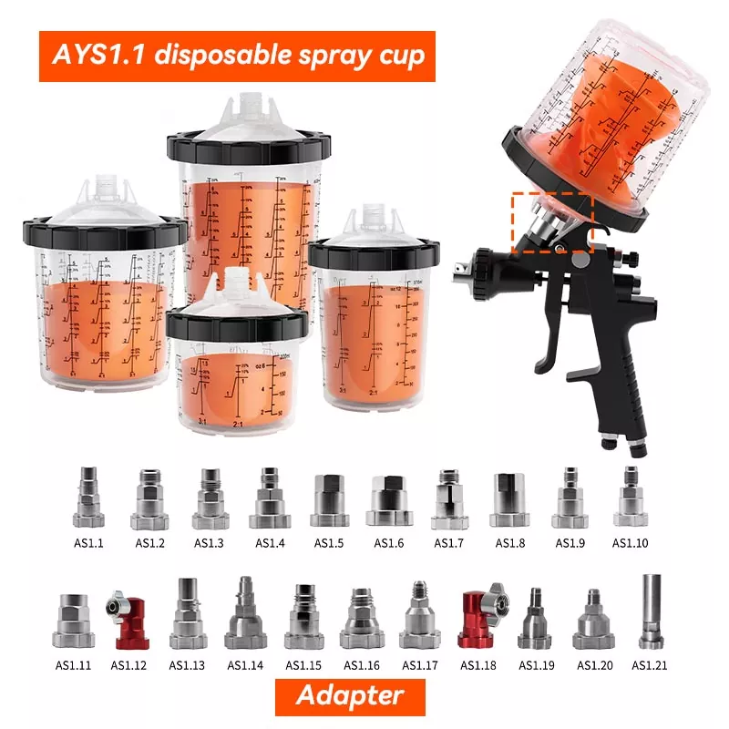 ถ้วยสเปรย์แบบใช้แล้วทิ้ง AYS1.1 เข้ากันได้กับอะแดปเตอร์ซีรีส์ PPS1.0 ด้วยอะแดปเตอร์นี้ จึงสามารถนำไปปรับใช้กับปืนสเปรย์ทุกยี่ห้อได้อย่างสมบูรณ์แบบ และสามารถใช้ในตำแหน่งใดก็ได้โดยไม่ต้องเสี่ยงว่าสีจะหยด
