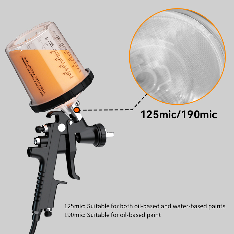 • ฟิลเตอร์ในตัวเพื่อการทาสีที่เหนือกว่า: ฝาครอบถ้วยสเปรย์แบบใช้แล้วทิ้งมีฟิลเตอร์ 190μ (สีน้ำมัน) และ 125μ (สีน้ำ) ในตัว กรองสิ่งสกปรกได้อย่างมีประสิทธิภาพในระหว่างการพ่นและเพิ่มความเงางามของสี 20%