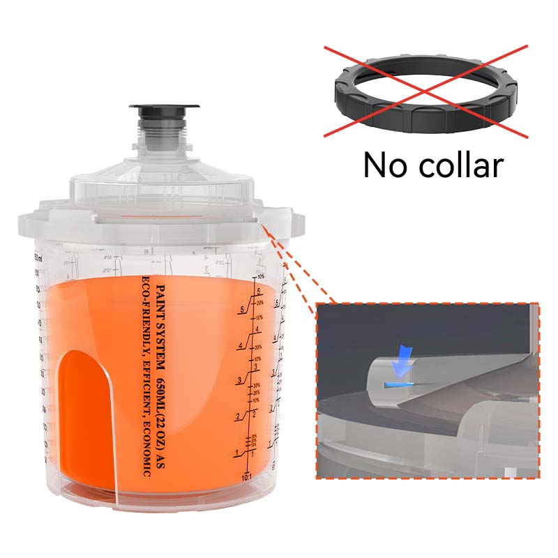 ปลอกคอ, ซึ่งก่อให้เกิดการเชื่อมต่อที่แน่นหนาระหว่างถ้วยและฝานั้นเป็นองค์ประกอบสำคัญในระบบถ้วยสเปรย์แบบใช้แล้วทิ้งมานานแล้ว ในระหว่างการวาดภาพที่วุ่นวายจิตรกรมักจะสูญเสียหรือสร้างความเสียหายให้กับคอป้องกันการใช้ถ้วยสเปรย์ที่ใช้แล้วทิ้งจากการทำงานอย่างถูกต้องสร้างความท้าทายที่สำคัญ